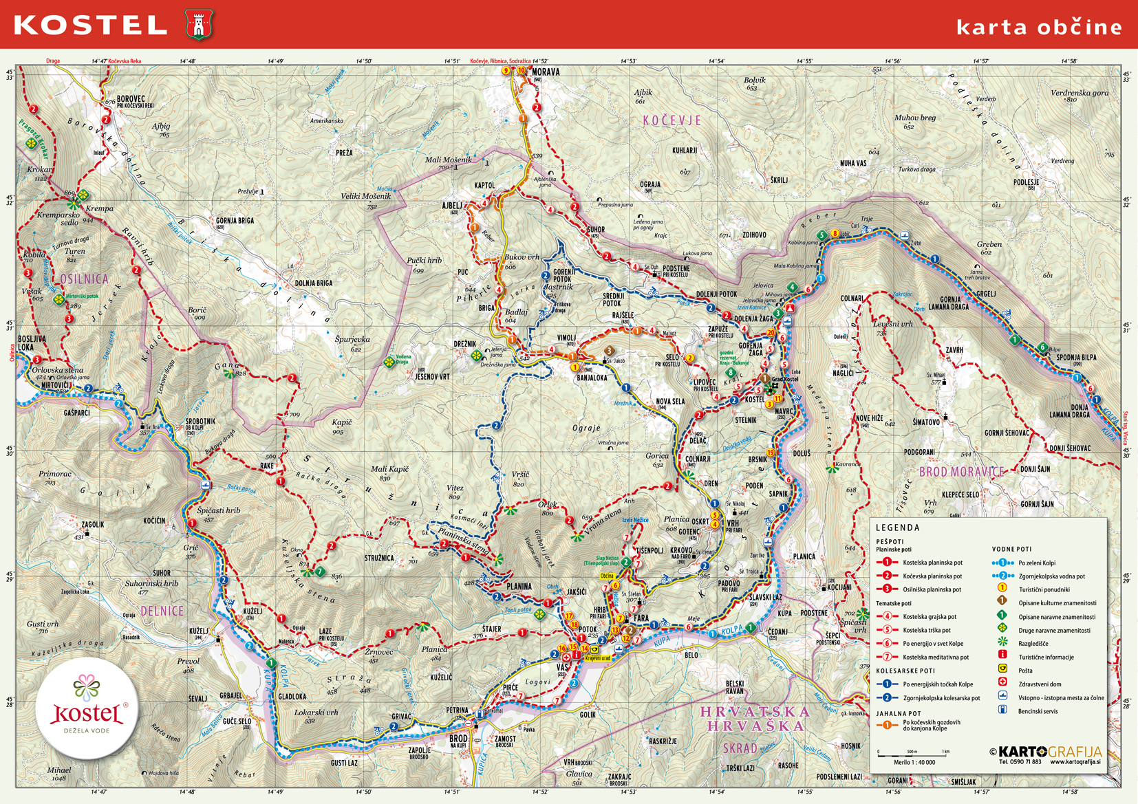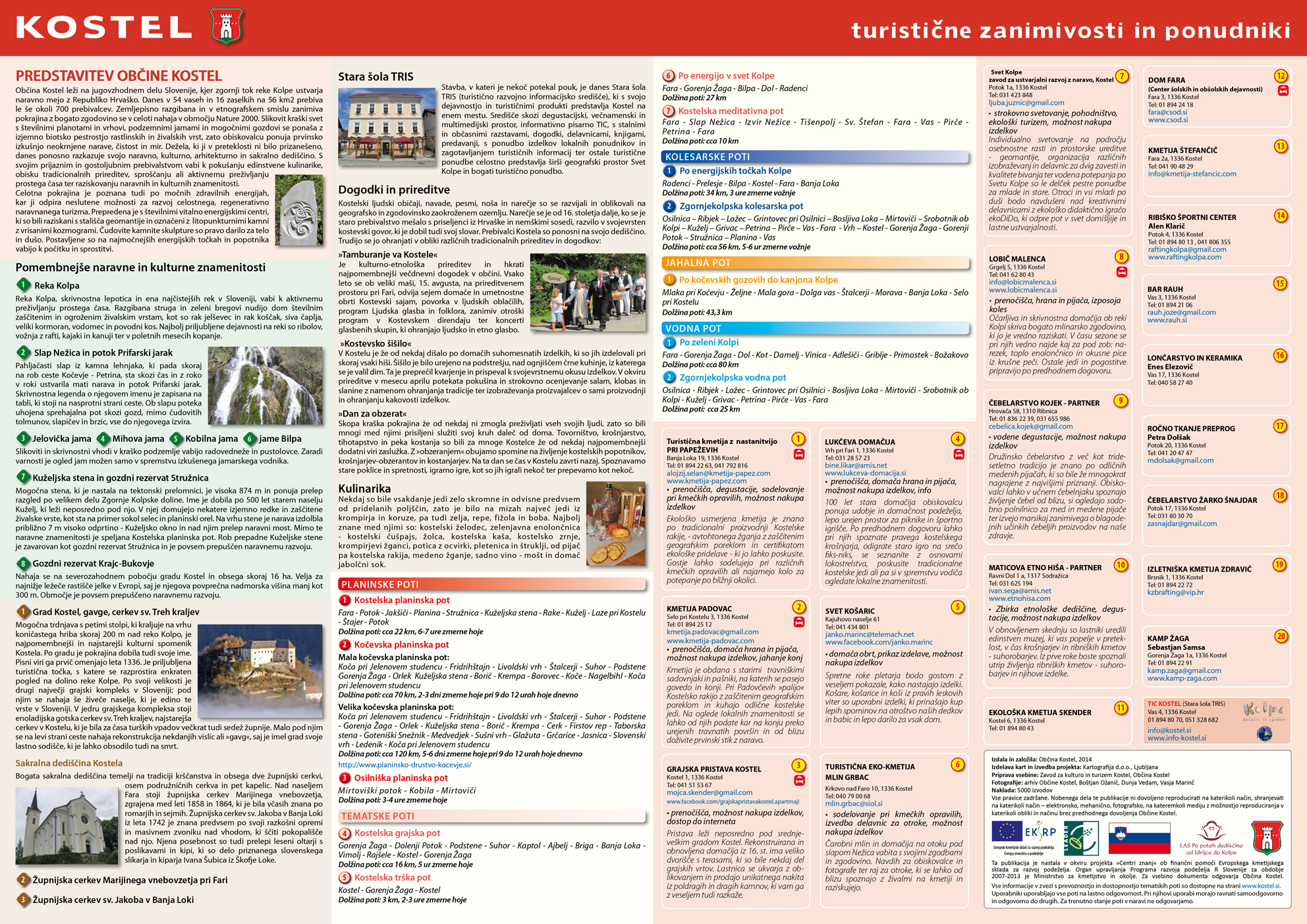 Kostelska pokrajina je mnogim dobro poznana, saj je s svojo neokrnjeno naravo, rastlinskim in živalskim svetom neponovljiv naravni biser. Med naravnimi lepotami Kostela moramo najprej omeniti mejno reko Kolpo, ki je ena najčistejših v Sloveniji. Domačija Lobič Malenca je tik ob njej tako, da peš, s kolesom, veslom v roki ali kako drugače z lahkoto pridete od in do nje. Je v krajinskem parku Kolpa, obdana z številnimi naravnimi in kulturnimi znamenitostmi, ki si jih je vredno ogledati. Na zemljevidu občine Kostel, ki je na spodnji sliki najdete zarisane poti, ki vas bodo vodile po prečudoviti Kostelski pokrajini. Na zloženki so zbrani in opisani gostinski in turistični ponudniki. Na enem mestu pa so tudi zbrane aktivnosti in znamenitosti, ki si jih je moč ogledati v dolini Kolpe.