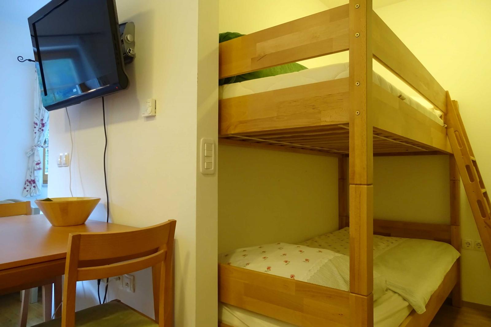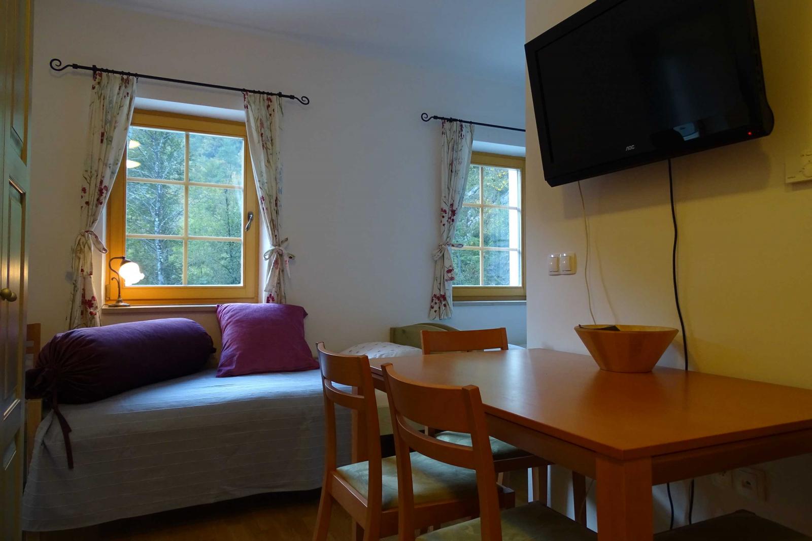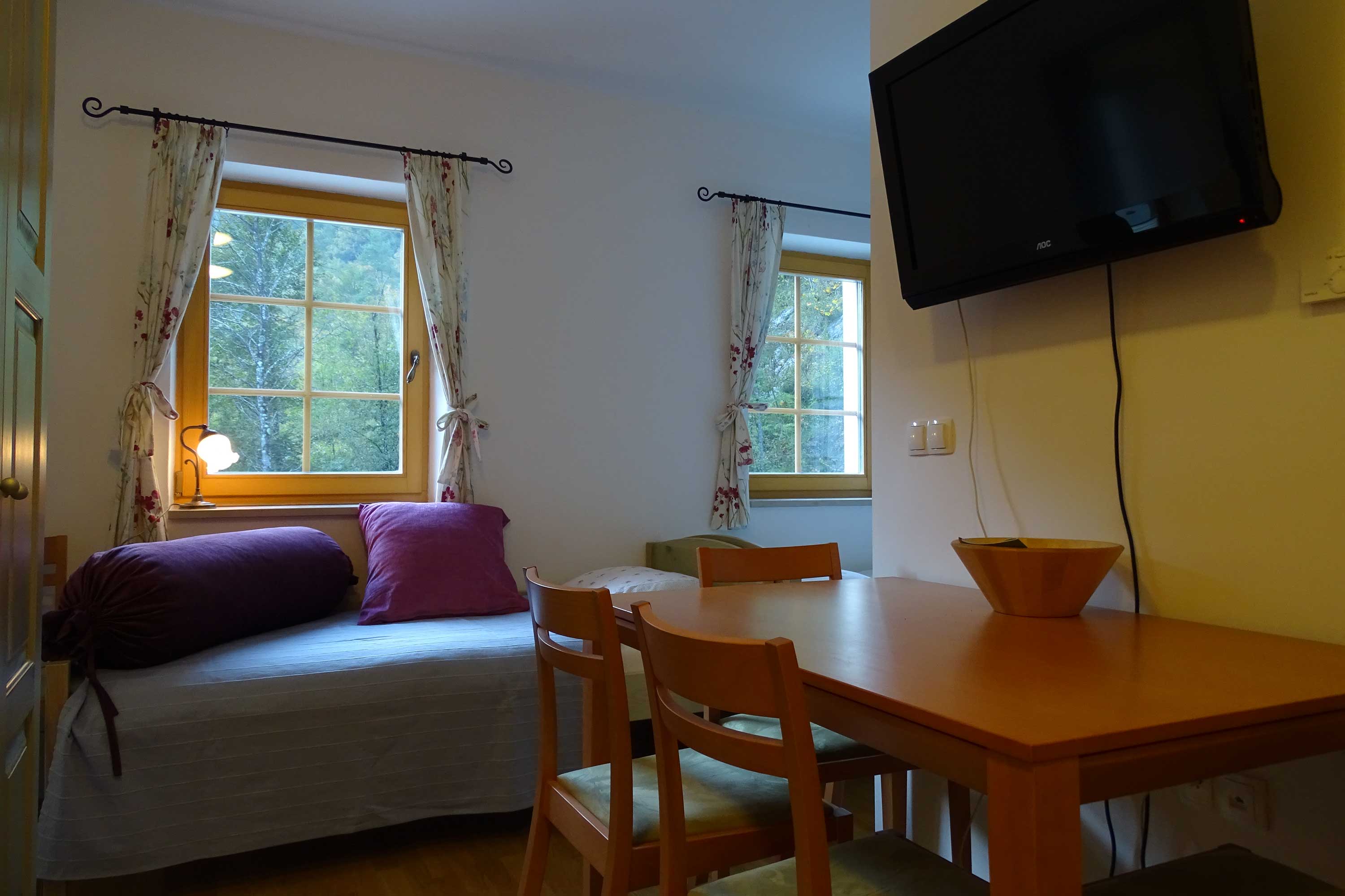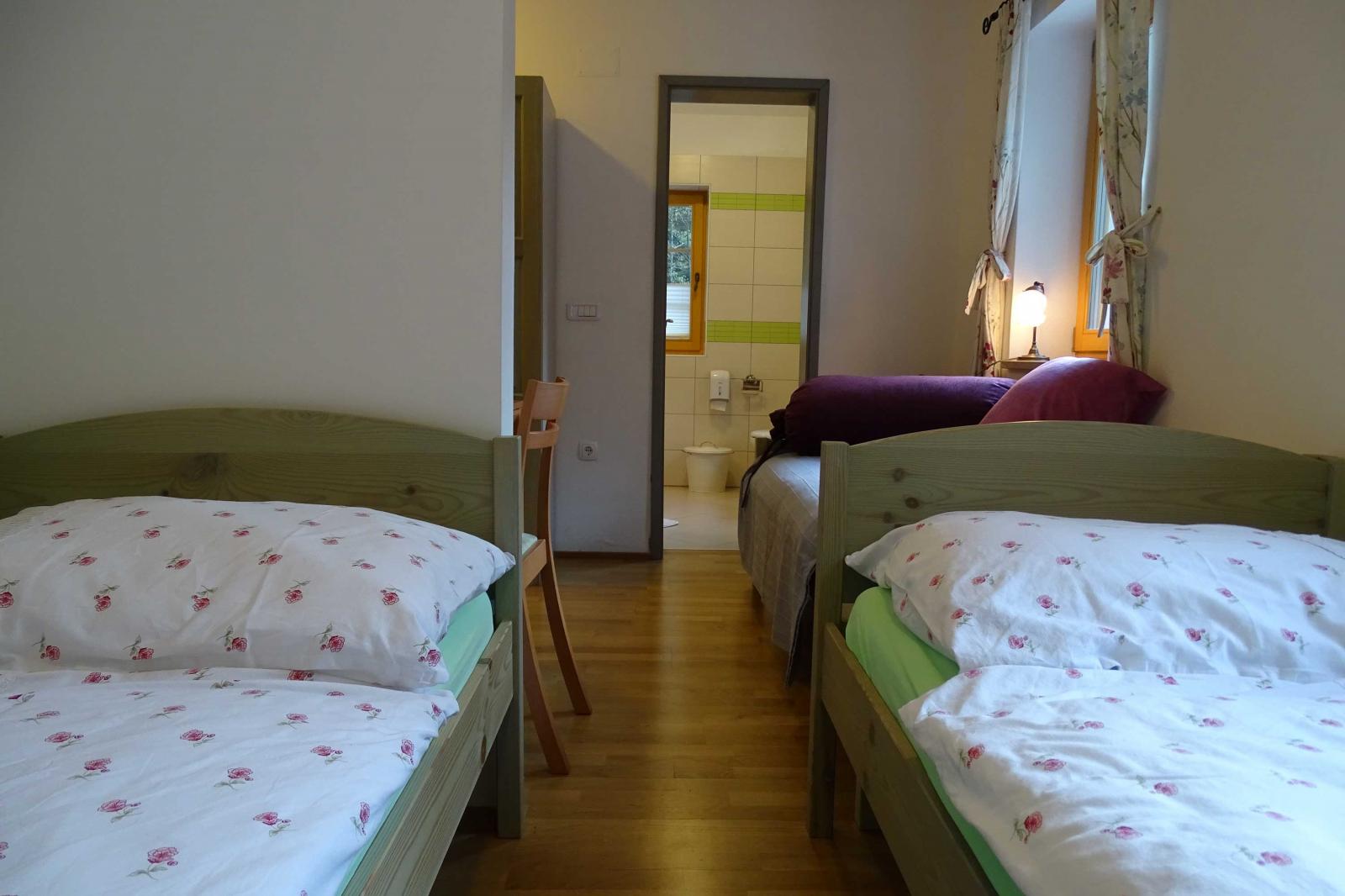 Svetlo sobo velikosti 25 m2 odlikuje veliko okno ob dveh posteljah. Ti dve postelji je možno pomakniti skupaj in ustvariti zakonsko ležišče. V prostoru je skupno 5 ležišč.