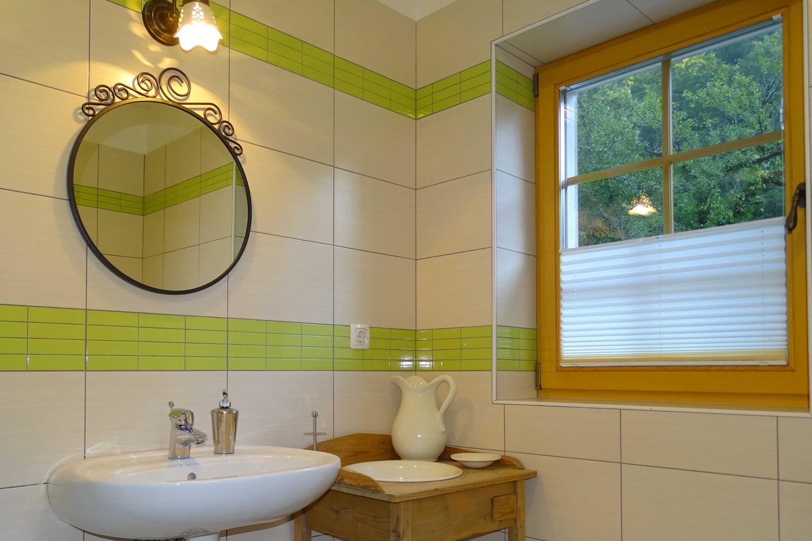 Ima prostorno kopalnico s tušem, kjer je del opreme iz » starih časov«.